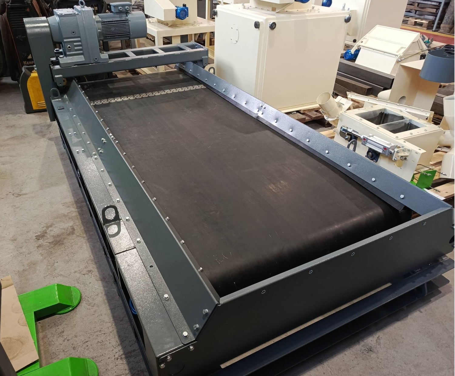 Дополнительные опции: лента для высоких температур эксплуатации, усиленные ролики, второй весоизмерительный участок, вибродвигатели и шиберные заслонки для воронки подачи материала, система управления для комплекса дозаторов